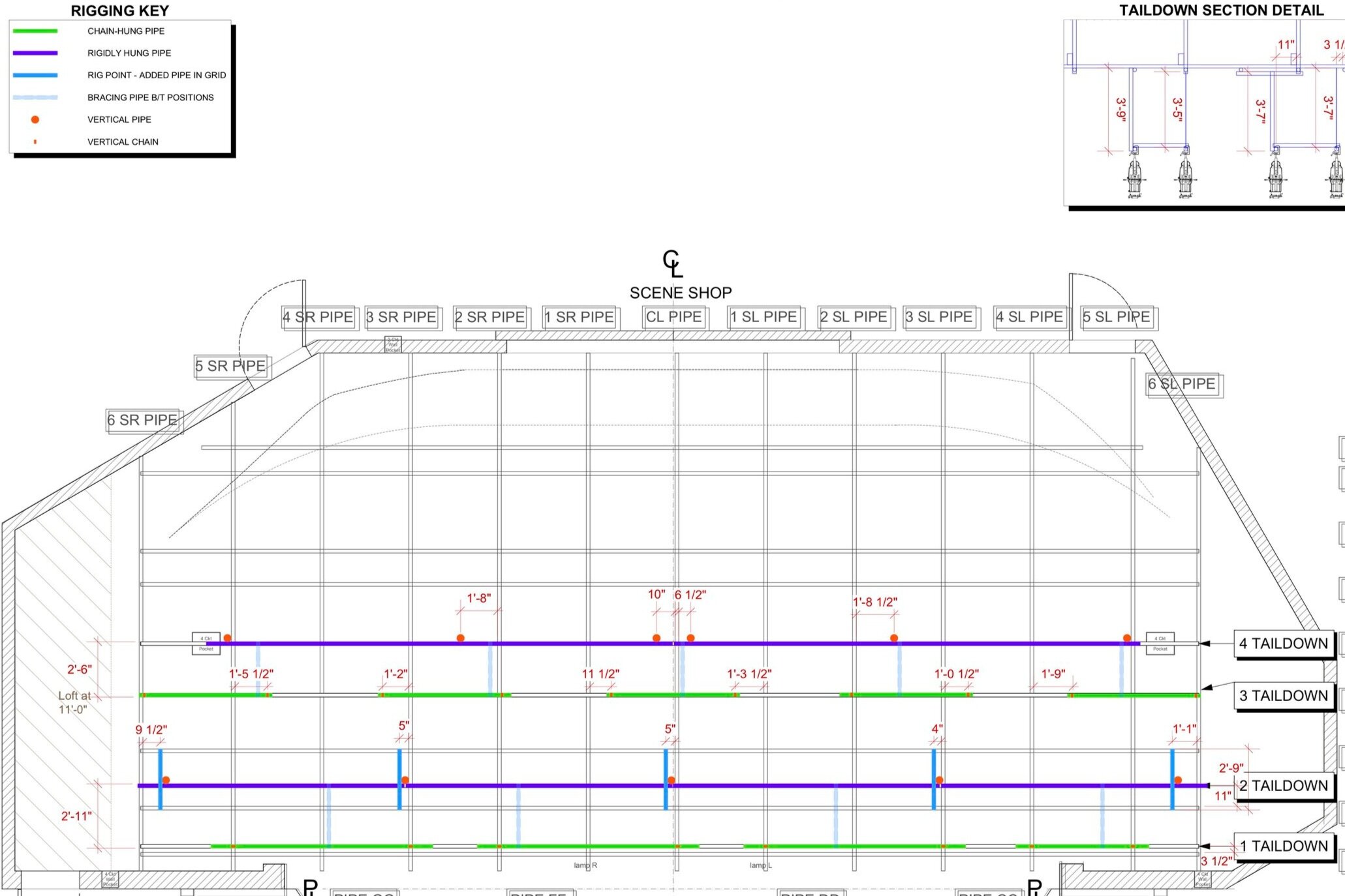 Lighting Section for Sovereignty by Mary Kathryn Nagle at Marin Theatre Company. This drawing helped determine where to place ladders to reach lighting instruments on the scenic hillside installation.